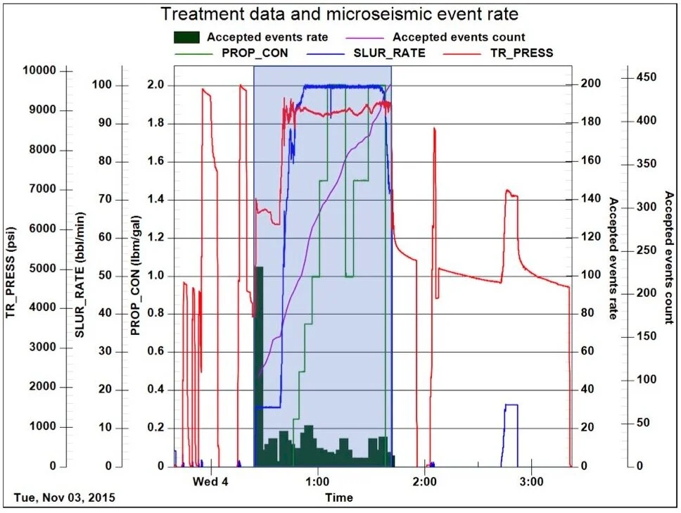 MSEEL 5H Stage 23 treatment data and microseismic event rate. Highlighted area corresponds to time duration of stage.